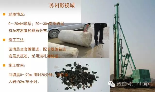 基于上述情況,項(xiàng)目部決定同時(shí)引進(jìn)多種工法設(shè)備進(jìn)行試樁,試樁的深度為該工程樁基礎(chǔ)設(shè)計(jì)深度:14-35米不等,試樁結(jié)果如下表: