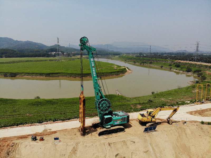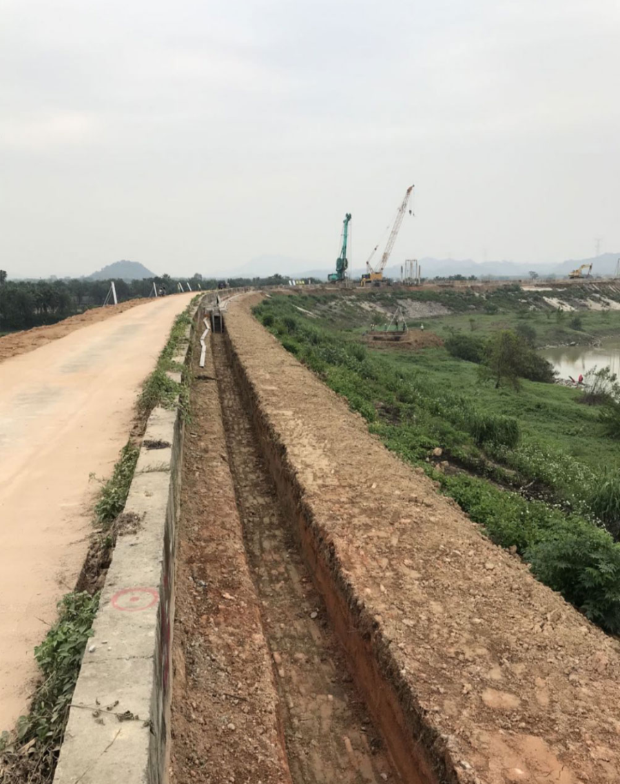 據廣州峻業公司王經理介紹,“本項目施工最大難點在于堤圍頂部寬度僅約5米難以滿足設備施工需求,同時標段施工現場內有3條高壓線及1條低壓線影響工程施工。