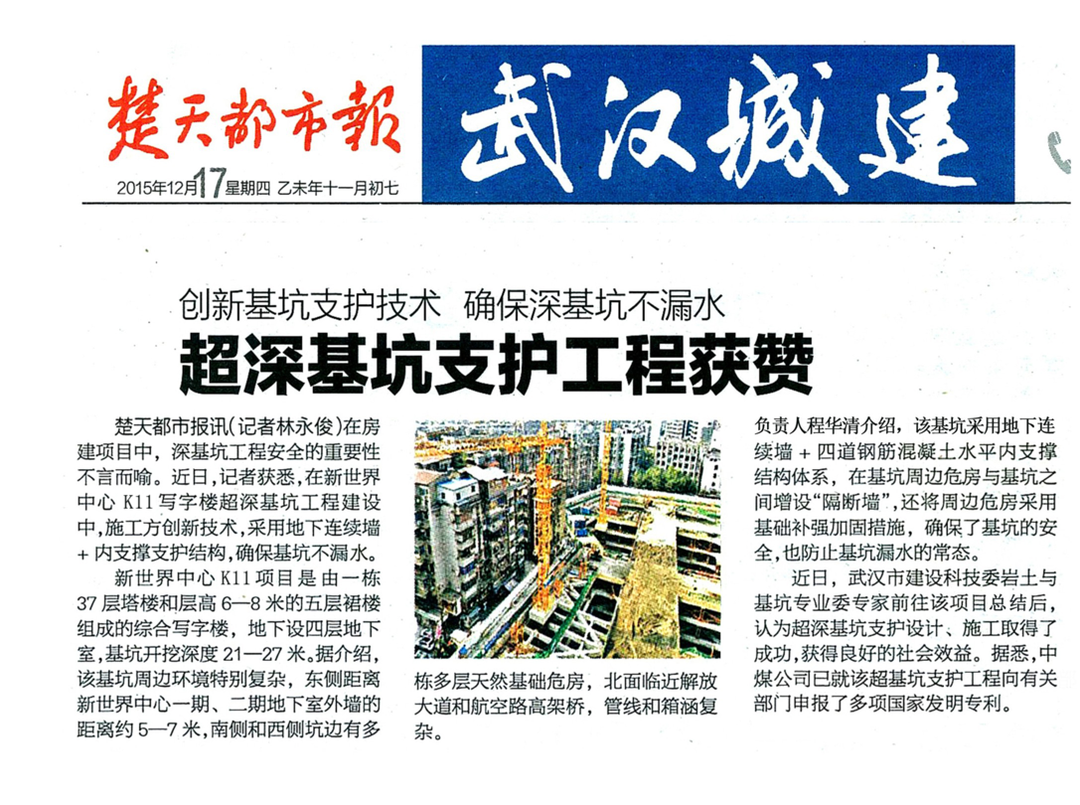 湖北中煤建設工程有限公司副總工程師李佳林在案例分享中提到:“金泰抓斗是我們騰飛的翅膀!武漢新世界中心K11——危房環境下的超深基坑支護工程在十分特殊嚴峻環境下,為了確保基坑及周邊環境的安全,我公司采取了“墻撐”、“隔斷墻”、“危房加固”及三軸攪拌樁帷幕止水、深井降水等技術措施,該項目被某著名地質大學列為巖土工程專業研究生的實習教材。