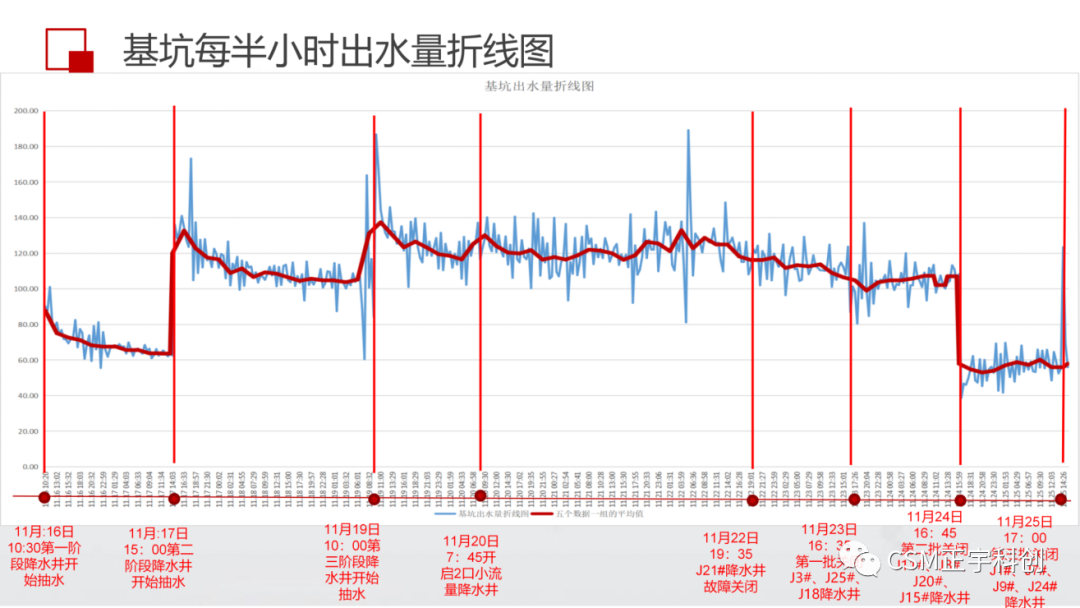 坑內外水位曲線匯總圖基坑每半小時出水量折線圖
